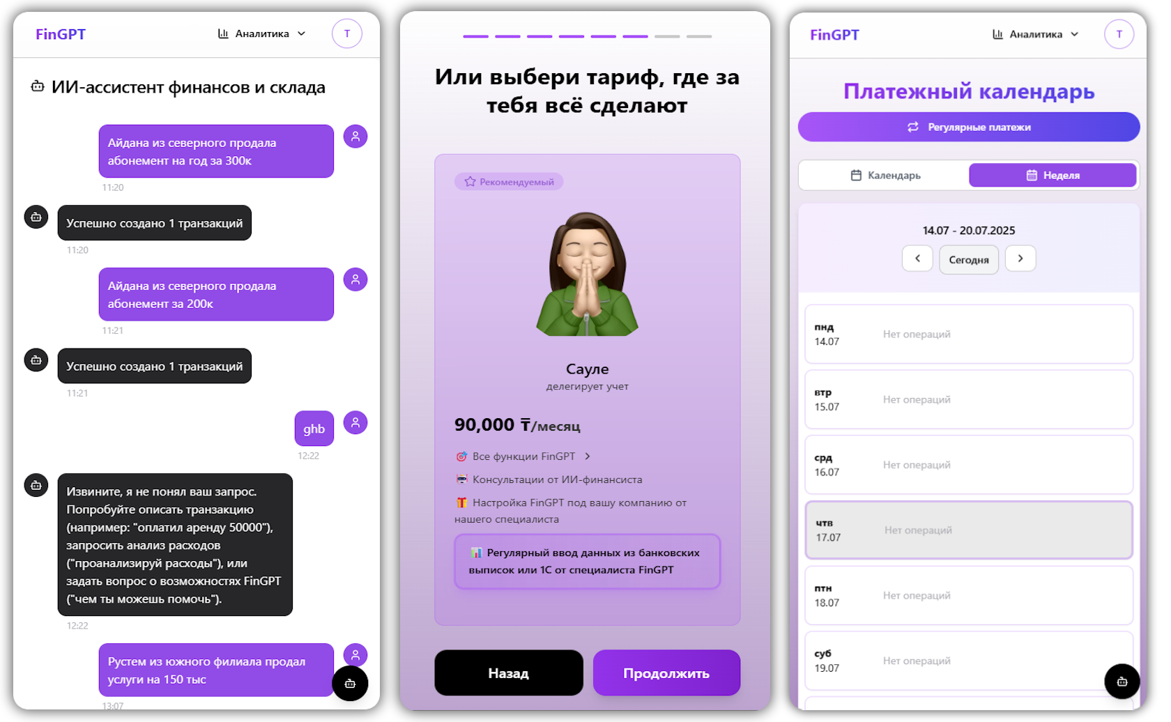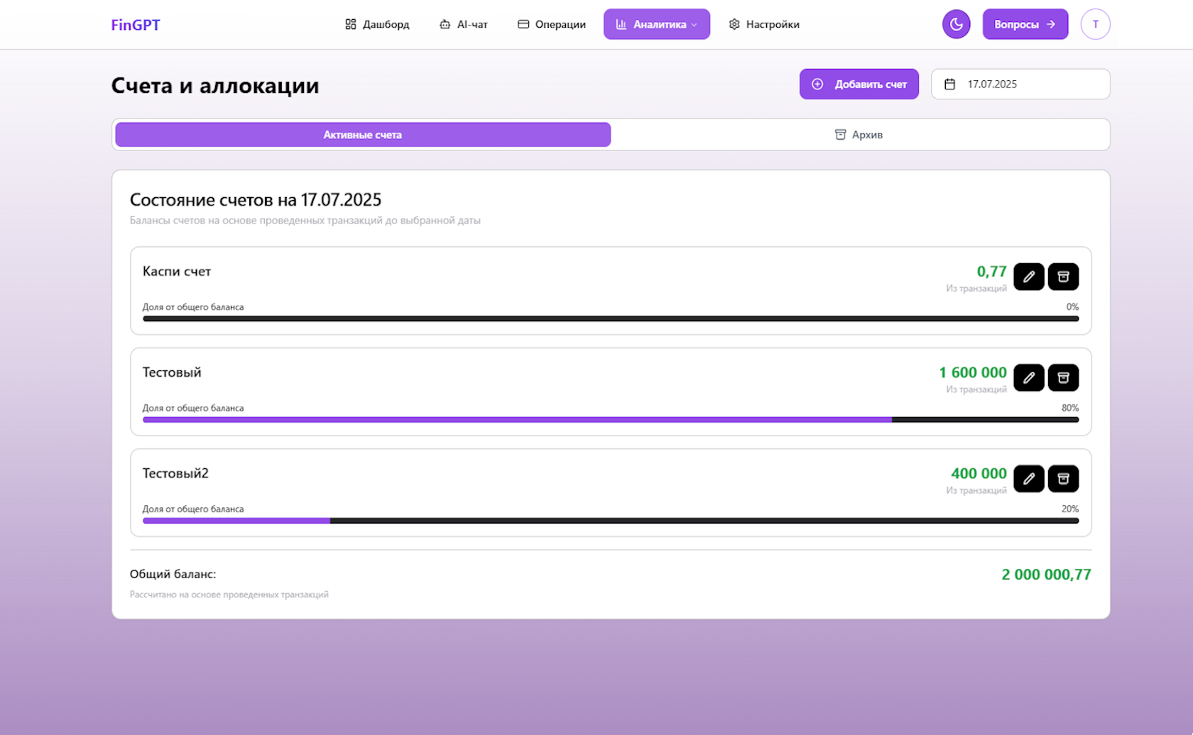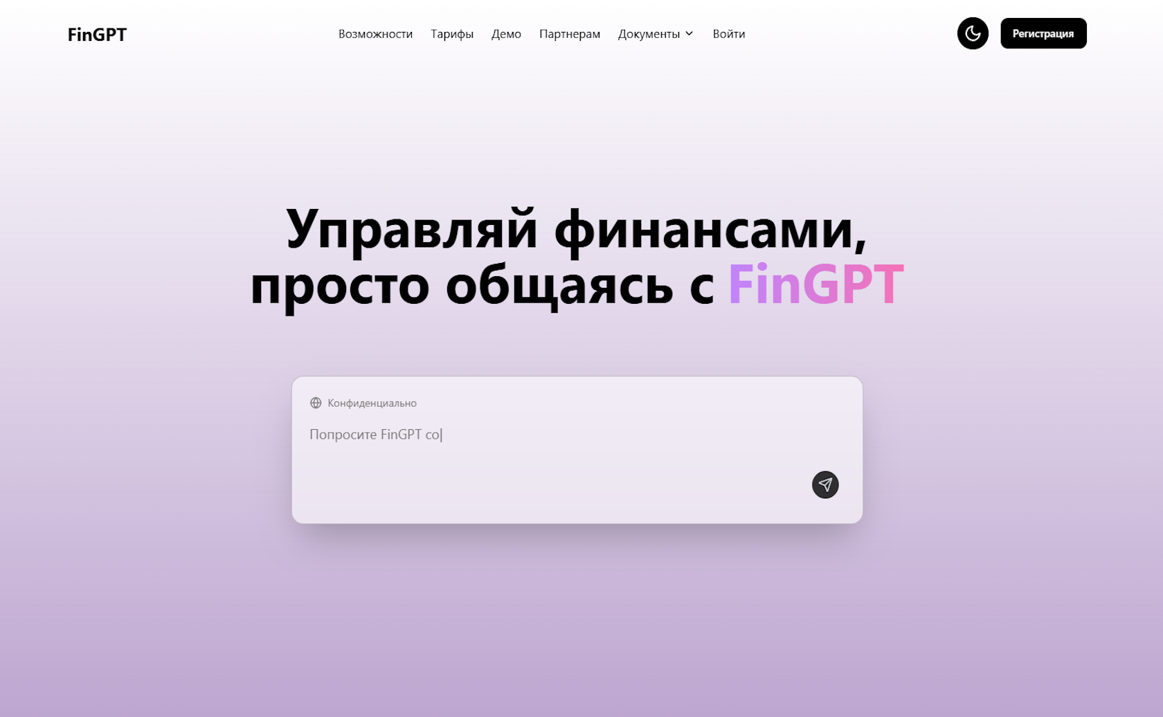Fingpt - это современный сайт для управления финансами с помощью современных ИИ технологий. Белая тема для интерфейса создает вариативность для каждого пользователя. На скриншотах можно увидеть, лишь малую часть функционала, который предоставляется на сайте.